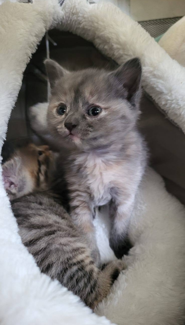 Trouvée en pleine forêt dans un carton avec ses 4 frères et soeurs à l'âge de 3 semaines, sans maman, nous avons dû la biberonner.